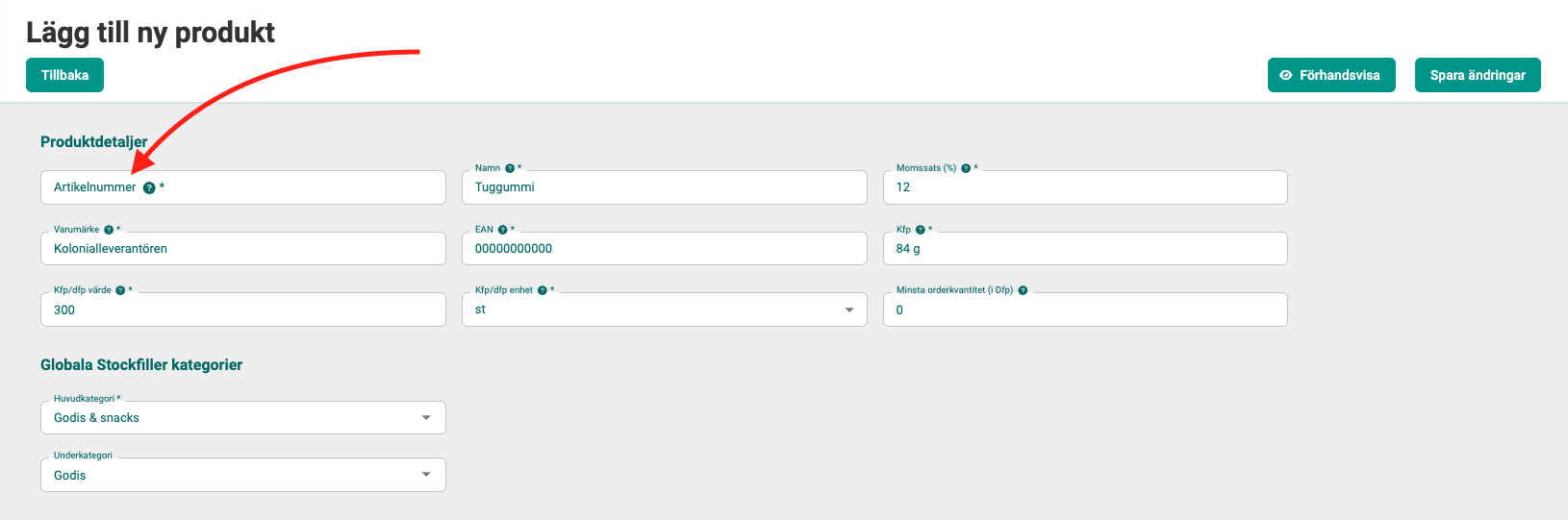 Du kan direkt inne i admin.stockfiller.com justera ett artikelnummer på befintlig produkt.